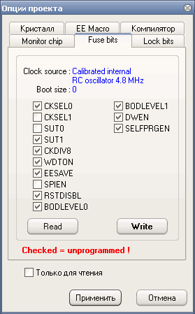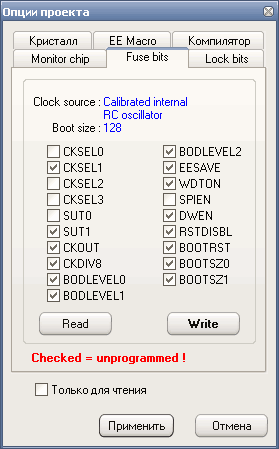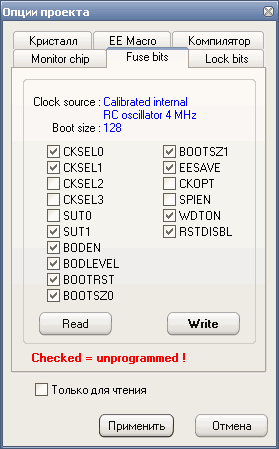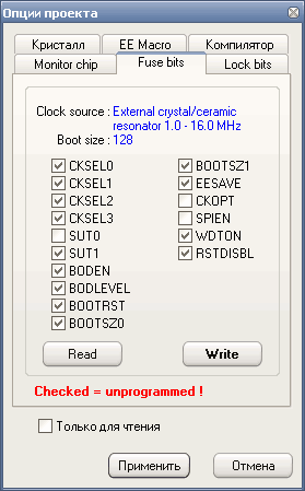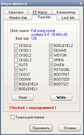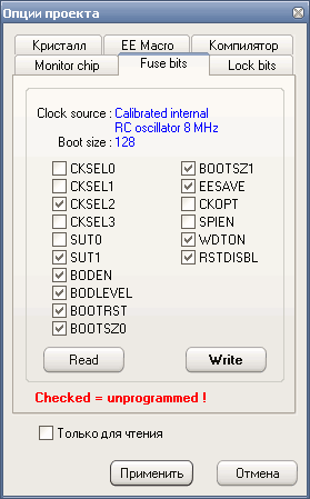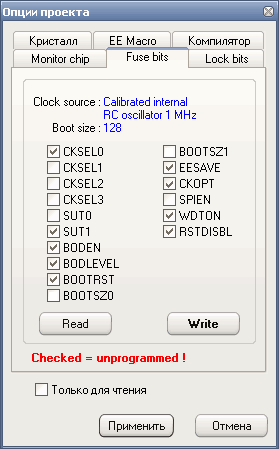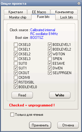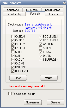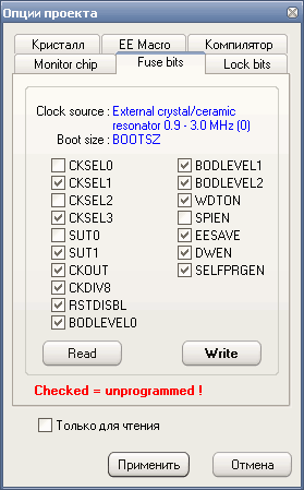 — снятая галочка– fuse bit = 0, фьюз запрограммирован / активный;